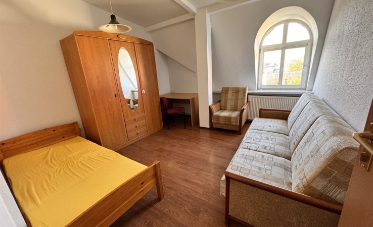 Przestronny pokój dzienny z rozkładaną kanapą, szafą i kompletem mebli