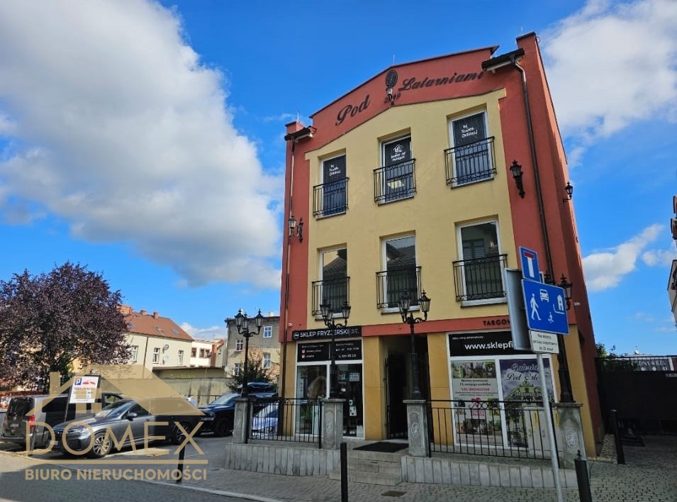 centrum Pszczyny w otoczeniu historycznych budynków, lokali usługowych i handlowych.